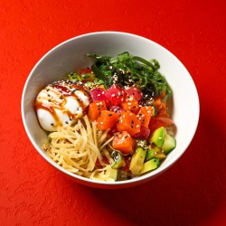 Поке с лососем и тунцом (в основе рис)