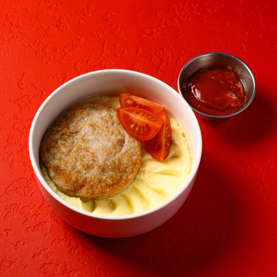 Куриная котлета, картофельное пюре, томаты черри, кетчуп