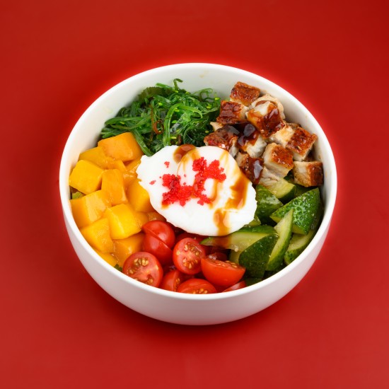 Рис, жареный угорь, огурцы по-сычуански, черри, чука, манго, икра масаго, яйцо пашот, соус cesar, соус терияки
