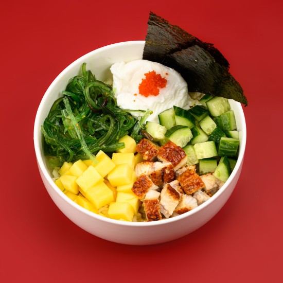 Рис, жареный угорь, огурец, черри, чука, манго, икра масаго, яйцо пашот, соус cesar, соус терияки