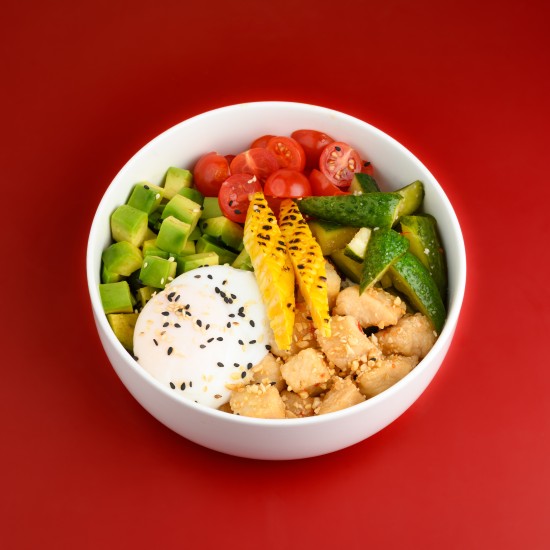Рис, жареная курица тясю, авокадо, огурцы по-сычуаньски, томаты черри, кукуруза, яйцо пашот, соус сладкий чили, соус айоли, арахис, кунжут