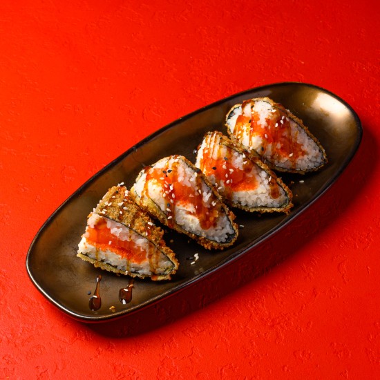 Рис, лосось, сливочный сыр, икра масаго, нори, темпура, соус унаги, кунжут