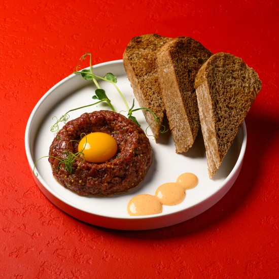 Говяжья вырезка, дижонская горчица, желток яйца, каперсы, соус тобаско, крем кимчи, красный лук, петрушка, ржаная чиабатта
