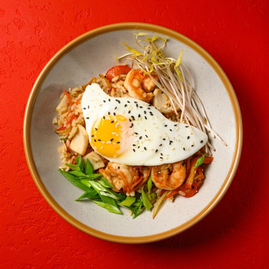 Рис, креветки, кальмары, кабачки, морковь, репчатый лук, сладкий перец, ростки сои, чесночный соус, кунжут, зеленый лук, жареное яйцо