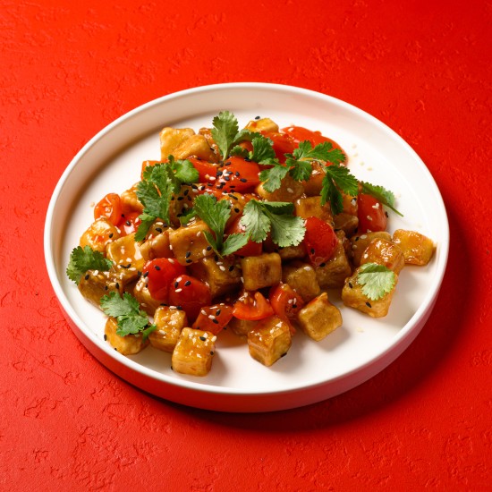Баклажаны, томаты черри, крахмал, кисло-сладкий соус, кинза, кунжут