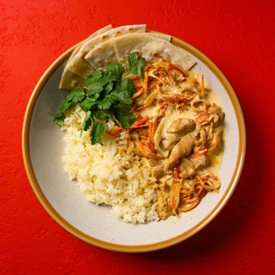 Рис, курица, морковь, репчатый лук, сладкий перец, карри соус, кинза, лепёшка роти