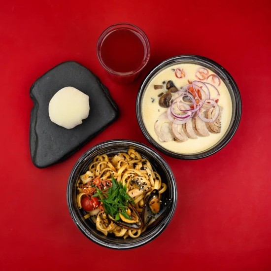 Самолепная пшеничная лапша, мидии, кальмар, белая рыба, шампиньоны, томаты черри, соус том ям, зелёный лук, кунжут