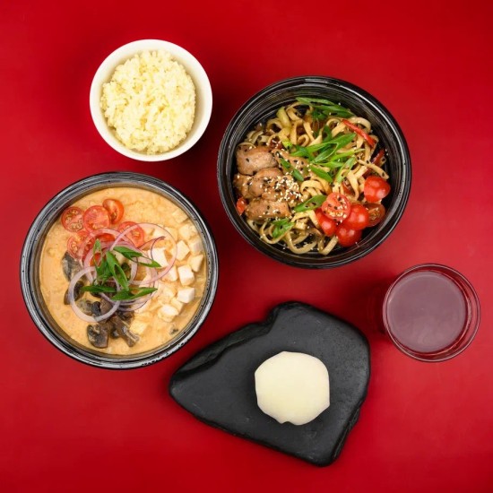 Бульон том ям, курица тясю, шампиньоны, томаты черри, красный лук, рис отдельно