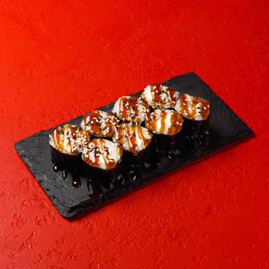 Рис, угорь, нори, сливочный сыр, соус унаги, кунжут