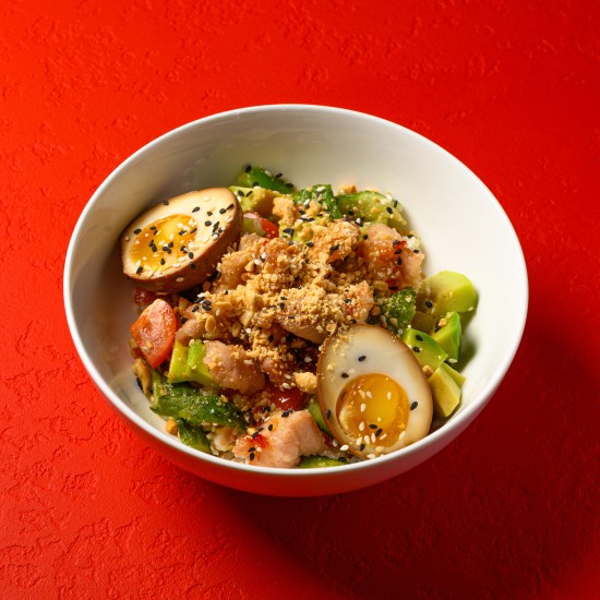 Листья салата, панированная курица, авокадо, томаты черри, огурцы по-сычуаньски, маринованное яйцо аджитама, соус сладкий чили, соус умами майо, арахис, кунжут