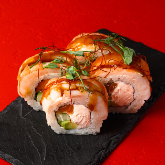 Рис, нори, креветки, лосось, сливочный сыр, огурец, авокадо, соус юдзу, нити чили