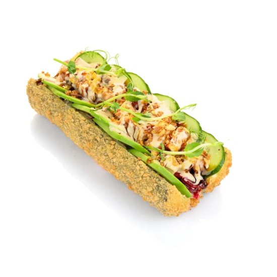 Обжаренный ролл в виде хот дога с угрём и креветками. King size.