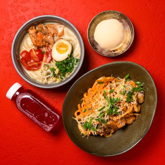 Сливочный мисо бульон, пшеничная лапша, лосось, шампиньоны, томаты черри, маринованное яйцо аджитама, ростки сои, зелёный лук