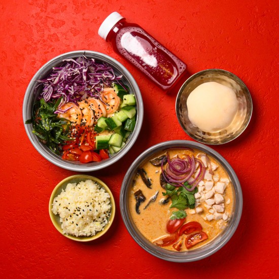 Бульон том ям, курица тясю, шампиньоны, томаты черри, красный лук, кинза, рис