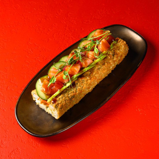 Рис, темпурный кляр, лосось, тунец, огурцы по-сычуаньски, свежие огурцы, такуан, салат айсберг, нори, соус терияки